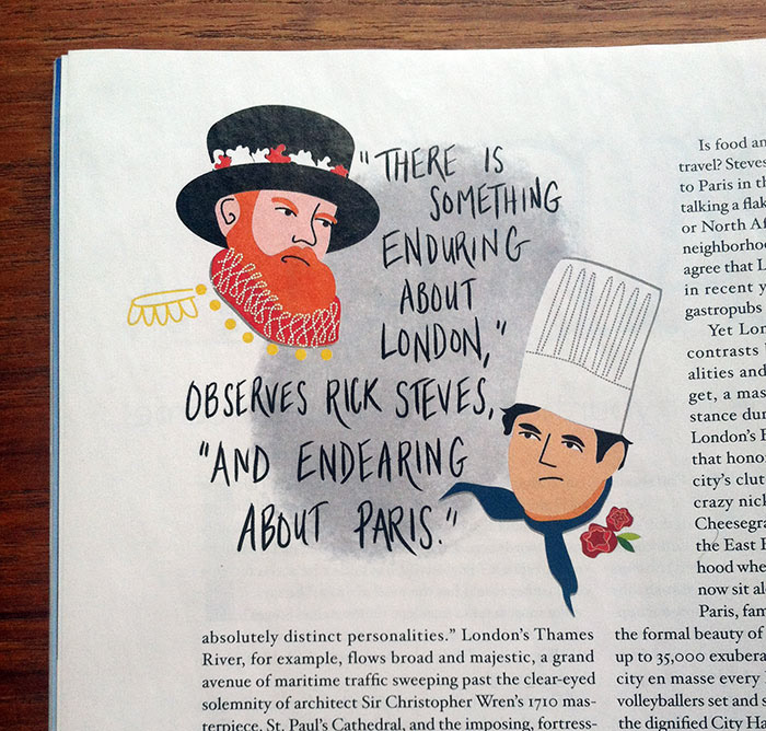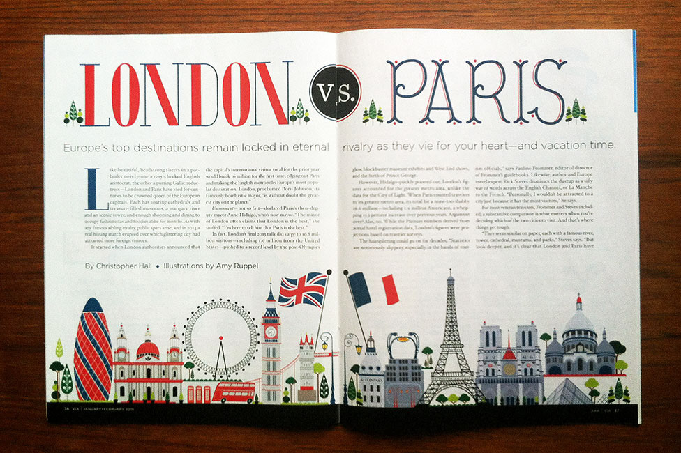 Illustrations (spread and spot) and type design for Jan-Feb 2015 issue of AAA's Via Magazine.